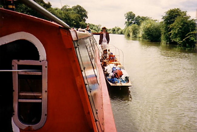 After winding the next day up at the Round House we set off downstream. At Tadpole we met a man in a punt. dressed in all the gear (striped blazer, straw hat, etc) who asked if we could give him a lift. He had just punted from London to Lechlade for charity, and now he was on his way back. The punt Ophelia was simply magnificent. Built around 1920 from Mahogany and brass, with beautiful paintings of Ophelia on the thwarts, she still had her original mahogany toolbox containing a spirit stove, brass kettle and teapot. We strapped her on the side and took her all the way to Oxford, with a hilarious stop for half an hour while we all learned how difficult punting can be.