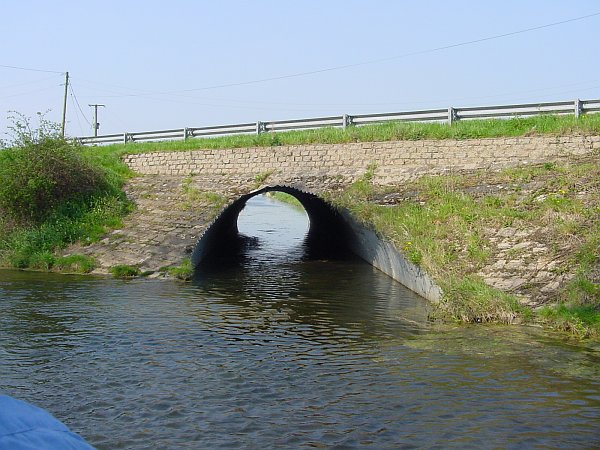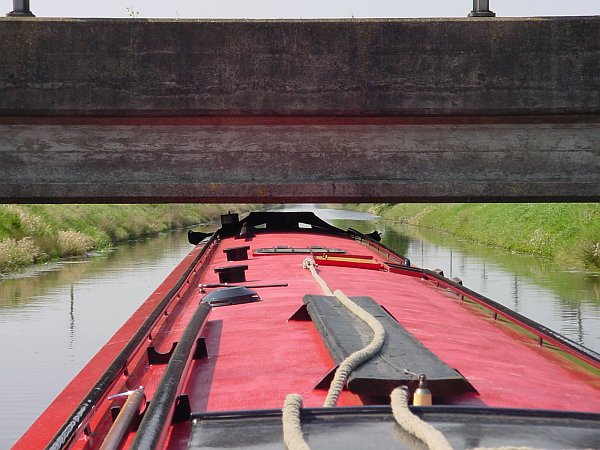 As you approach South Kyme village you meet a road bridge whose height is indicated by a hanging metal bar just beforehand. Wud-E-Nuff had been unable to pass under this bar before, but the river level was several inches down and we cleared it with 3 inches to spare. We then measured almost 6 inches of clearance under the bridge, showing that the bar was distinctly pessimistic (why do they always do that); as the bar is hung from chains, this now established for the future that if Wud-E-Nuff could pass under without lifting the bar by no more than a couple of inches, then it would pass under the bridge too.