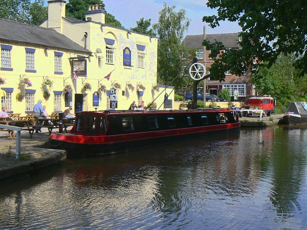 Soon we were through Braunston and up to Fradley. For once there was no queue at the locks, so we passed straight through and decided to stop at Armitage outside the Plum Pudding. The ground here has subsided amazingly, so that the canal which once lapped its doorstep is now level with the upstairs windows, The landlord once told us that while the coal mines were still being worked, the pub was sinking visibly every day: one morning the milkman delivered the bottles through a crack which had developed in the wall overnight, and for a while if a ball fell off the (propped up) pool table, it would often roll right across the floor and out of the door. The picture that I took from the road shows the height of the canal now.