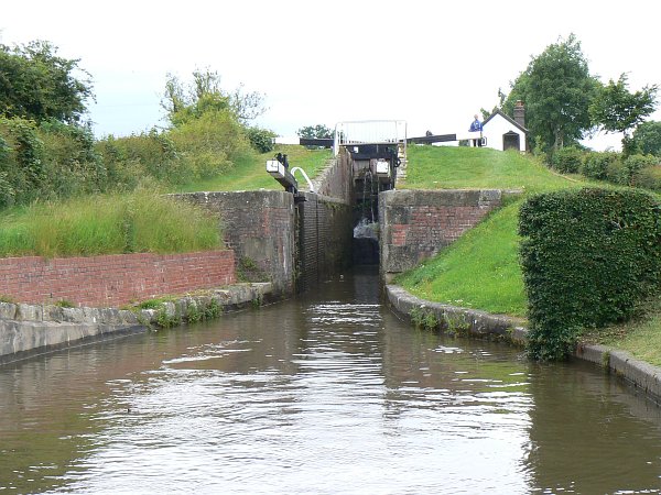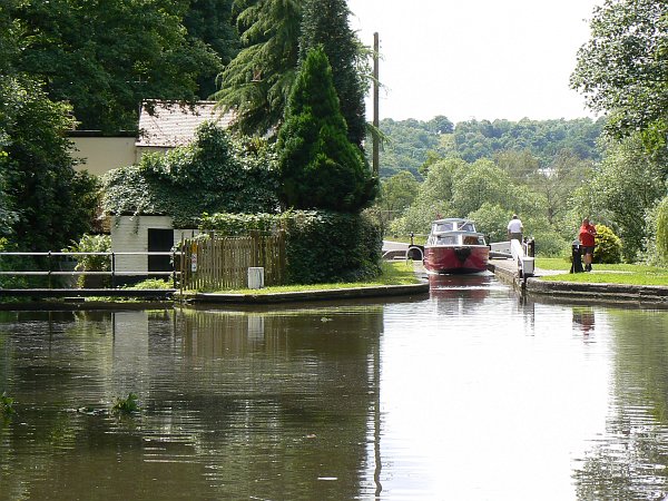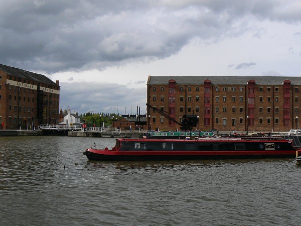 Now it was midsummer's day and, guess what, it was so cold and wet that we had the stove alight! It was also so windy that trees were falling everywhere, and we were careful not to moor near any tall trees. Instead we spent an afternoon and evening in the pub at Coven with a group of friends from the Canalworld Forum. By now we'd decided where we wanted to go next: Gloucester. So the next day we headed south again. We stopped in Kidderminster to stock up in Tesco's; while Debbie shopped I had a most enjoyable chat with Paul of 'Waterway Routes' who tours the system with a video camera strapped to the top of cratch, making DVD's of the popular rings. We then moved on to have a leisurely lunch at Pratt's wharf, where the remains of the old lock down to the river Stour look to be in excellent condition, before carrying on down to Stourport and the River Severn.