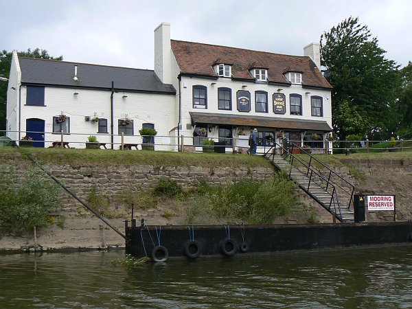 We had wondered about stopping at Upton-on-Severn, but they were having a jazz festival and the boats were breasted up 6 deep on the moorings so we carried on upriver. Nearing Worcester I'd spotted that a large and rather fancy cruiser had pulled out from its mooring about quarter of a mile ahead of us and was heading rapidly up towards the lock. Using the VHF radio I immediately called the lock-keeper to announce our imminent arrival, and the cruiser was held in the empty lock to wait for us; he was not pleased at this and was even less pleased because our bows had to be within a few feet of his shiny GRP stern (but the bottom gate cleared us by less than an inch as it was closing so we had no choice!). It was a beautiful day, so we carried on almost to Stourport and stopped at the excellent moorings provided by the Lenchford Inn. What an evening we had there; the highlight was that the birthday party in the upstairs room had booked an Elvis impersonator for the evening. He was a really good singer; there is something blissfully surreal about sitting on the bows of your boat with a drink in your hand, watching the sun set over the river and listening to Elvis Presley through the open pub windows.