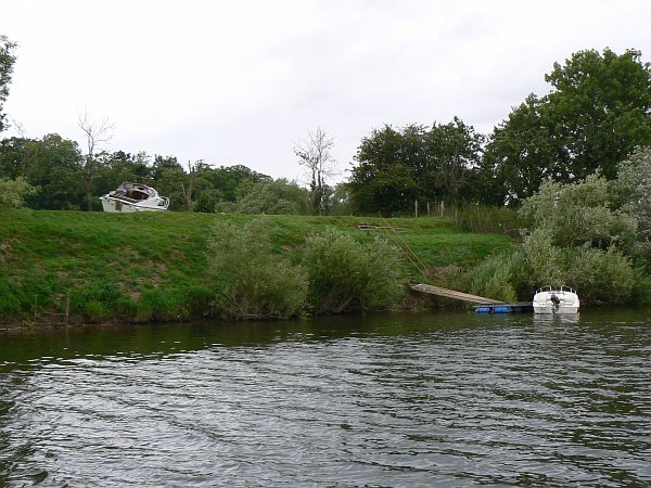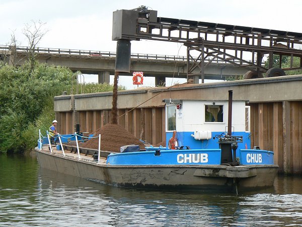 The next morning found us back on the river as soon as the lock was opened at 8am, making our way upstream against a gentle current. Soon after passing under the M50 bridge (I'm getting a good collection of pictures of the underneath of motorways) we passed the wharf where the gravel barge "Chub" was being efficiently loaded, one of the few remaining commercial enterprises on our waterways, and then we reached the useful old wharf at Severn Stoke. It's derelict but still quite sound and long enough for a full-length narrowboat to stop. It would be perfectly adequate for an overnight stop, but it's particularly useful as somewhere to pause and let the dogs 'stretch their legs'.