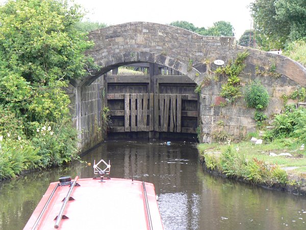 So we made our way back up to Todmorden again, and stopped for the night outside the Golden Lion pub there which was advertising a Steak Night. We had the most fabulous 3-course meal there, for a price which would hardly have bought just a starter back home, accompanied by some excellent drinks. Looking at the lock we could see that we would have a big problem getting through the lock the next morning, as there was so much water pouring over the top gates that it would be impossible to wait in the lock; even with the front doors sealed up to protect the cabin, the quantity of water in the front well-deck would probably sink us. The only practical solution would be to lower the water level in the upper pound by opening the paddles at both ends of the lock for an hour or two, although that might flood the pound below so we would probably have to run some water through the lock below us as well. In the end, however, the level dropped overnight to about the same as it had been on our downward journey, and we were able to pass through the lock without the water being more than a couple of inches over the foredeck.