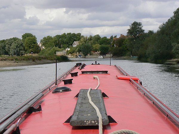 When we were a hundred yards short of Kempston bridge we ran hard around on a bar of shale which ran across the entire width of the river. In 2004 the river had been in flood so we had crossed it without noticing, but this time it was obvious from soundings with our long shaft that we were not going to be able to cross it. Unfortunately this also meant that we were 50 yards short of the winding place, so we had to reverse for half a mile before we could turn around just below the large island. Happily we made our way back through Bedford, where we attracted a large crowd of spectators when passing through the lock, and made our way back to Great Barford for another night.