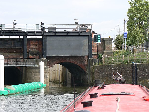 I had been slightly concerned that I might not spot the moorings for the Black Sluice lock but I need not have worried; as we passed a disused railway bridge the mooring pontoon was plainly visible ahead of us with several of the other narrowboats already moored to it. We had a long wait as the Black Sluice lock can just take 2 boats at a time, so we had to wait for the 4th locking. Eventually we got the green light, and we made the wide sweep across the tideway to complete the turn into the lock.