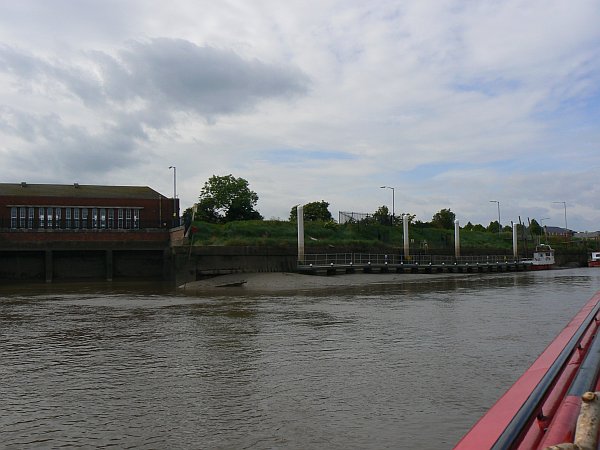 Arriving back at Boston, we waited on the pontoon before entering the lock. We were feeling slightly nervous about the run up the Haven to the Grand Sluice, having been warned that we would have only 11 minutes to complete the 1 mile 111 yard journey (all the 1's there!) if we were to reach the Sluice in time for the 3-minute window of passage. We were expecting a big rise in the lock, to match the fall that there had been on our incoming journeye, but in fact the outer gates were opened as soon as the incoming tide made a level. My goodness the tide was coming in at a rate! We were swept quickly around towards the centre of Boston, and then we rode the tide up through the Haven to arrive at the Grand Sluice several minutes early; indeed we had plenty of time for a chat with the lock-keeper before the level was right to let us back on to the river.