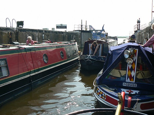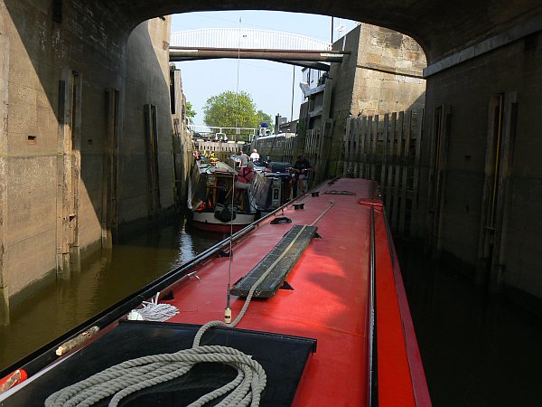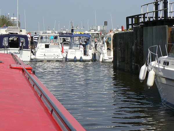 By using the whole chamber the lock-keeper managed to fit 19 boats into Cromwell Lock so it was certainly very full. The cruisers sped off into the distance, and all the other narrowboats soon left us behind, but we knew that we were relatively early so there was absolutely no need to hurry. All the cruisers had assembled 2 or 3 abreast on the moorings below the lock, and the 4 other narrowboats who were going our way waiting for us in the lock. The lock keeper called us on the radio and invited us straight in as we approached; it didn't seem possible for us to fit in the remaining space but he was determined to fit us in, saying that he had managed 5 narrowboats once before but couldn't quite remember how he did it! Eventually after turning first one way - to shut one gate - and then the other, we squeezed in and were lifted up to the Fossdyke.