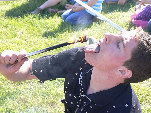 Finally the main celebrations of the weekend took place. The Medieval tower had been opened to the public for the first time in 600 years so the whole event had been given a Medieval theme; the entertainments included sword-fighting, jousting and heavy horse displays, medieval crafts such as sewing and sword-making, fire-eating, dancing, music, and a quantity of medieval drinks. Finally the day concluded with a hog-roast and a concert by numerous artists including the local group The Ruffs whose song "Inbred and Proud" just has to be seen to be believed (this YouTube link opens a new window. Turn your sound up loud!)