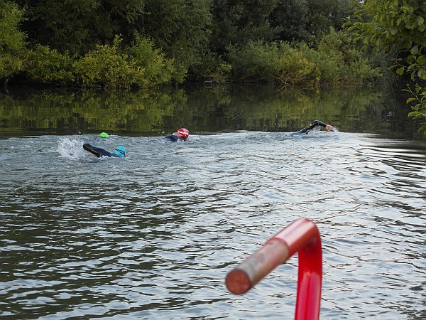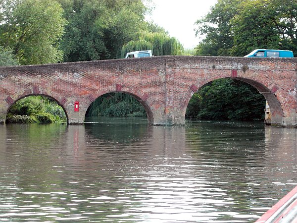 Below Shiplake lock we were flagged down by a large (and rather pretty) green cruiser that had broken down. The steerer said that the engine had stopped in mid-river so he had simply pushed his teenage daughter overboard and then thrown her the bow rope, telling her to swim to the bank with it and pull the boat to safety from there. Her version of the story matched his exactly, except with the addition of some slightly more colourful language as she hung her wet clothing out to dry. We took them in tow, using cross-straps which were an amazing new technique for these river-folk, and had an interesting time taking them up-river. The bridge at Sonning needed particular care as they were considerably wider than us; the navigation arch is quite narrow and is particularly awkwardly placed if you are trying to take a photograph of the pillar-box at the time (why would there be a letter-box built into the piers of bridge, where it can only be reached by water?). Our entry into Sonning lock with the two boats went very well indeed, and I was pleased to be complimented by the lock-keeper who had been warned of our approach by the keeper at Shiplake and had made sure the lock was ready for our arrival.