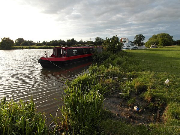 The Avon was absolutely delightful, flowing slowly beneath wonderful summer sunshine. Telford, of course, did not like it as much as he liked the canal, but even he had a thoroughly good time running around the fields where we moored overnight. The river seemed to be almost deserted, until we reached Pershore which for no apparent reason was jam-packed solid with boats. As we travelled down the river from there we began to worry that we may not be able to find a good mooring for the night, but after a couple of hours we spotted that the last three feet of the public mooring at Comberton Quay were clear. We reversed back to that point, and tied the stern to the bank leaving the rest of the boat swinging around in the river, then dropped the mud-weight from the bows to hold them steady. This was perfectly fine for us, but caused amazement amongst the cruisers who were moored on the rest of the Quay; as I walked past with the dogs I could hear people talking on their phones and saying to their friends "you'll never guess what a great big narrowboat has done so that he can moor up!". As it drew darker I was worried that our bows were at least 30ft from the bank and could be a hazard to any night-time traffic; although such traffic would be very unusual I took the precaution of setting up a riding light which would remain alight all night, and I was glad that I had done so when a number of inflatable rescue-boats came flying past us on a late-night training exercise.