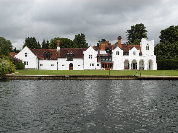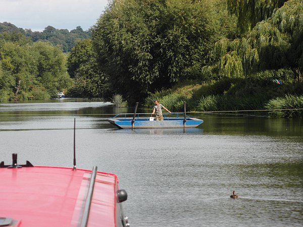 It seemed as if there were festivals everywhere. The huge Reading festival was being assembled as we passed, with temporary roads to acres of car-parking space, a temporary footbridge across the river, and temporary campsites that were bigger than most of the villages we had visited on our travels, were all being created by an army of men in hard hats and hi-vis jackets. Then further down-river at Remenham there was a 1980's festival which meant that we had to turn around and moor on the opposite field nearer to Henley. Within just a few seconds of my driving the mooring pins into the ground, a friendly man in a fast dinghy was alongside us to collect our £8 mooring fee; it was an expensive mooring but the dogs loved the field and we had a most enjoyable evening in Henley - including a couple of absolutely superb beers in the Olde Bell which claims to be the oldest building in the town.