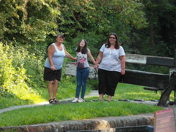 We had arranged for Vicki, Paul, and Lauren to jn us again at Warwick. A large crew is particularly useful for the Hatton flight, and we were lucky enough to meet another boat whose family were joining them at the same place at the same time. Together we flew up the locks in just over 2 hours, giving us plenty of time to carry on to Lapworth and part of the way down the Stratford canal. Paul had left us at the top of Hatton but Vicki and Lauren were able to stay with us for the rest of the week which was delightful. We had time to enjoy the sights of Stratford, although we didn't go to the theatre this time, and then confused everybody by going backwards down the lock to the river because that avoided a lot of manoeuvring in the crowded basin.