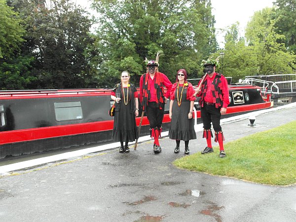 As we climbed Stoke Bruerne flight we could hear the sound of distant drumming, which was explained when we met a team of Morris Dancers by the top lock with a very loud drummer. They were thrilled that the colours of our boat matched their costumes, and posed for photos before we continued on our way.