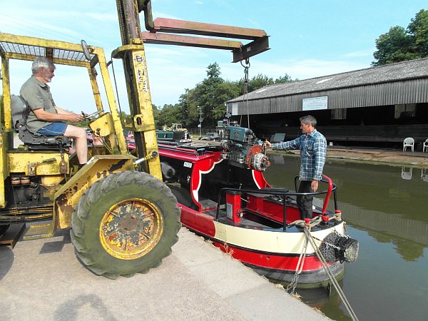 We had expected to have to go into the dry-dock but Jonathan our engineer assured us that he would prefer to use the wharf outside his workshop, where he could use his enormous fork-lift truck to lift the engines in and out. In no time at all Dorothy had been lifted out of the boat, and the steelwork was being modified to provide a nice smooth bed for Bertie.
