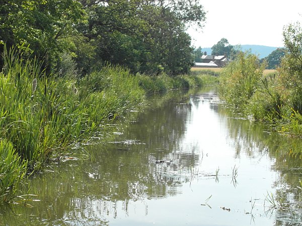 Our trip down the beautiful, peaceful Montgomery canal was delightful in the hot sunshine. We passed a small horse-drawn trip-boat and carried on to the old limit of navigation at Gronwen where we winded and continued down the newly-opened section beyond the bridge (there is no winding-point on the new section, so one direction must be travelled in reverse). The new section was wonderful, with stunning views across to the Welsh mountains, and was deep enough to make reversing fairly easy so the 3/4 mile trip took us about an hour. The few people whom we met - or whose houses we passed - rushed to take pictures of us as we passed. It turned out that only a handful of boats had travelled the section before us, and that the official opening ceremony was going to take place the next day so disappointingly the bunting was not actually there to celebrate our arrival.