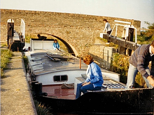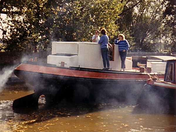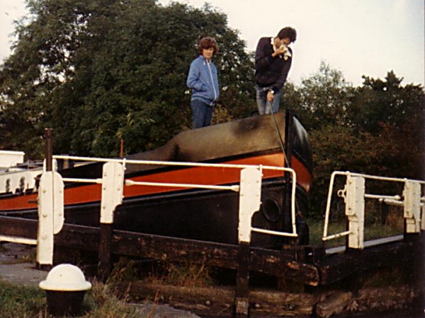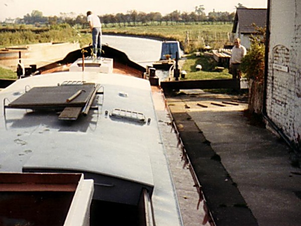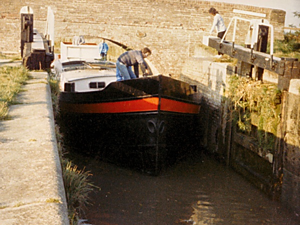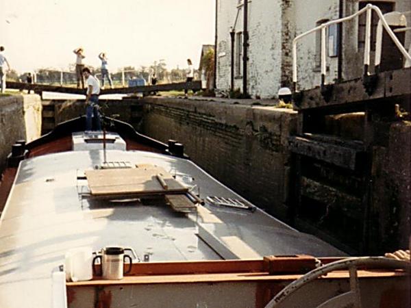 John and James welded a sheet of steel over her hold, started up the engine, and brought her across to England on the next calm day. I met them at Brentford to help with the task of bringing her up to Leighton Buzzard; this was a doubtful enterprise as BW had assured us that it was impossible because she was 76' long x 14' wide, with a draft of 3'6". In fact, apart from constantly running aground and inevitably shaving trouble getting round the bends, the biggest problems were at the low bridges. At the locks we had no difficulty apart from needing to put the rudder hard across to shut the gates - unless you count the problem of how to stop 60 tons of boat when there's not enough water available for the propellor to bite.