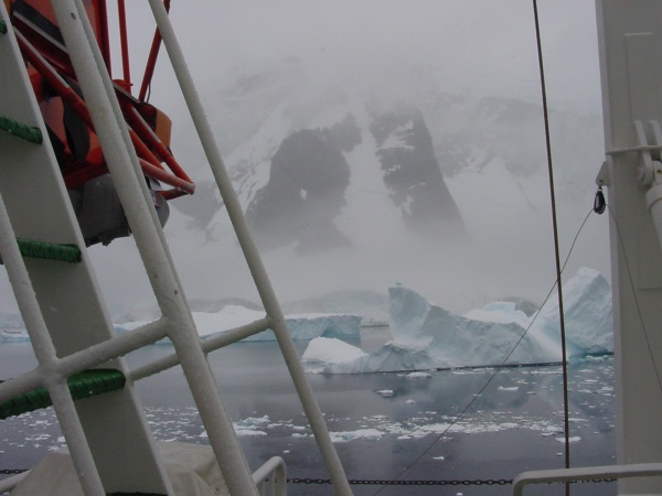 Before we left Half Moon Island the cloud lifted and we could see Arctowski Peninsula, part of the main land. We navigated the Errera Channel on our way to our next port of call seeing Leopard and Weddel Seals resting on the ice floes. Of course the icebergs have had penguins jumping on and off them for the last couple of days - the penguins and seals regard the icebergs as their cruise ships!. Once across the entrance of Andvord Bay we saw another ship, the Marco Polo, as we passed close to Waterboat Point where the early explorers were able to go ashore to collect snow to melt for drinking-water; it is now the site of the Chilean base of Gonzales Videla.