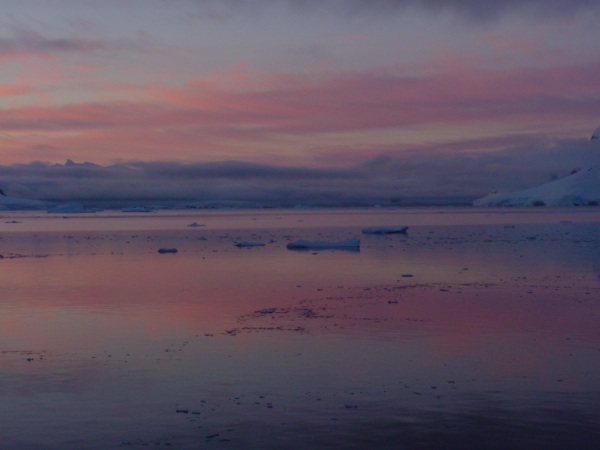 Mid afternoon we arrived at Almirante Brown Station at Paradise Bay which is on the actual continent of Antarctica. This is now Argentinean owned, although they seem to have abandoned it due to lack of funds. The sight that greeted us was wonderful; snow, and lots of it, on the ground. This is what most people think Antarctica is like, however this is the first ground covering of snow we had seen. The other landings had been on pebbles and rocks. What fun - the first people ashore had built a snowman, and lots of other people were having snowball fights. Allan decided to walk to the top of the mountain, Debbie tried to follow but the snow was so deep she took one step forward and two back, eventually falling flat on her face! Defeated she went back to the landing site and watched the penguins and the Minke whale in the bay. Allan succeeded and took some wonderful photos of the view from the top. Coming down was a lot quicker - a path, rather like the Cresta run, had been made - you sat down and were soon at the bottom! Altogether it was a most enjoyable time ashore, followed by the most spectacular sunset we’ve ever seen.