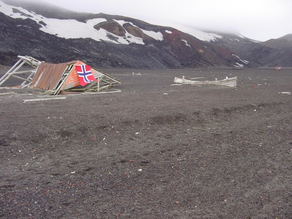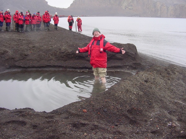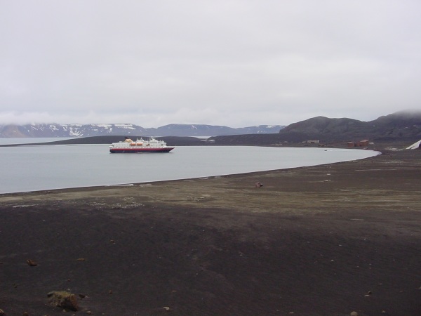 Overnight we cruised through the Neumayer Channel and Gerlache Strait heading for our next, and last, port of call in Antarctica: Whaler’s Bay at Deception Island. Deception Island is an active volcano: the last time it erupted was in the 1960’s. The entrance is very narrow and known as Neptune’s Bellows, but when you cruise through the gap you enter an “inland” lake in the crater of the volcano. The ground is covered with black volcanic dust which is very difficult to walk on - rather like soft sand, but the quarter mile walk to the heights of Neptune’s Window was well worth the struggle. The volcano is still very active, so that if you dig a hole in the volcanic sand it will fill with hot water. Some hardy (maybe foolhardy) passengers wallowed in the warm pool then rushed into the freezing sea! All were rewarded with glasses of Norwegian Aquavit. There is also a derelict Whaling station on the island which attracts a colony of penguins. Being the opposite end of the bay to Neptune’s Window there wasn’t time to visit both places unfortunately.