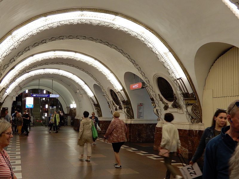 We were then led along the streets to the nearest Metro station. I was intrigued to find that their ticketing system is completely different to ours, for you must pay to enter the system (although at certain times such as late evening it is apparently free of charge) but you do not pay according to the distance to your destination so there is no need for any ticket check either at any intermediate point or at the exit, which seems to make the system very smooth-running. As a group we followed our guide down the escalator, deep beneath the streets of St Petersburg, and then made our way individually to our destination where the coach was waiting to take us back to the ship.