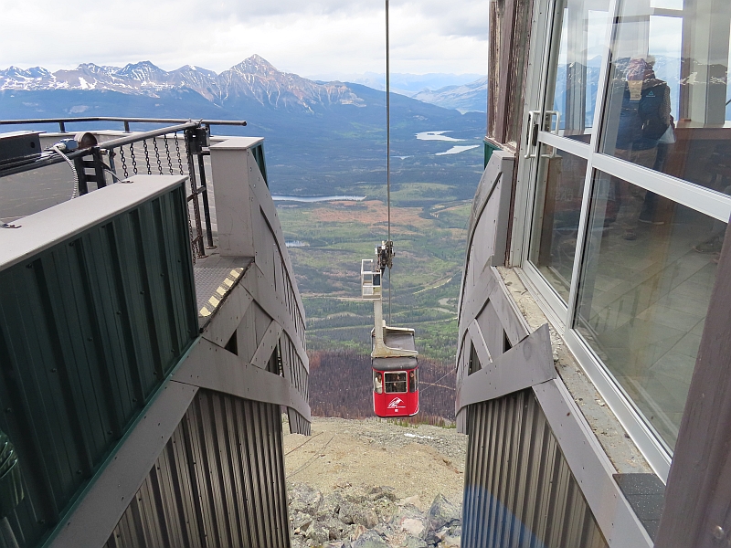 We had a day of free time in Jasper before our train to Toronto was due, and while most of our group chose to visit Lake Maligne to enjoy its scenery and wildlife, we decided to be a little more adventurous and take the Skytram cable-car to the top of Whistler's Mountain. The friendly taxi driver who took us to the lower station took us along the road where a mother bear had been spotted with her cubs just a few minutes before, but she had gone by the time we got there. Apparently female bears with cubs seek the company of humans as a way of getting away from their males (who do not like humans), but this particular one was getting too friendly and would soon need to be moved away. Indeed, at that same place, instead of the bear there was an elk grazing peacefully at the roadside.