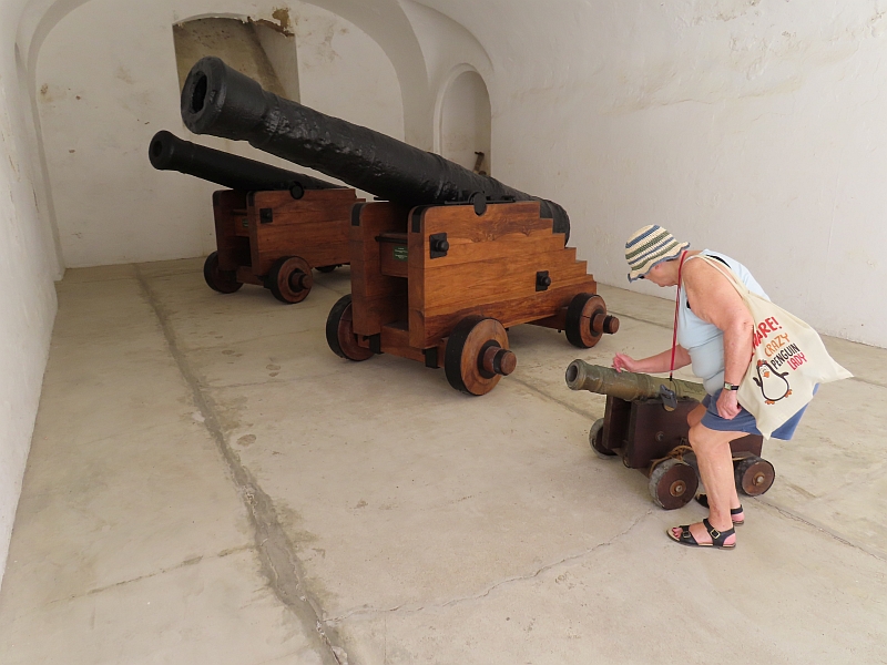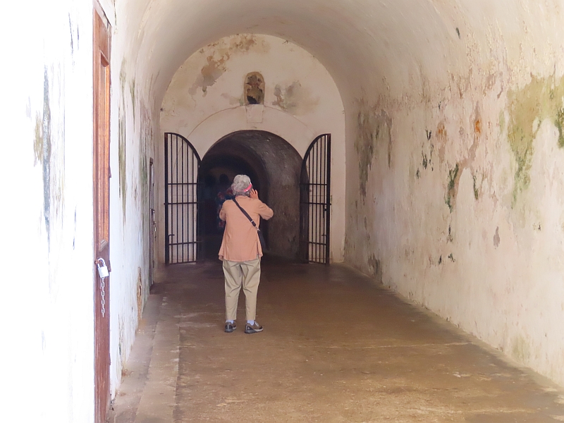 Old San Juan is dominated by a large fortress. Built 500 years ago, it is now presented as an excellent museum. With a good view of the harbour, its exhibits include the various everyday buildings (sleeping quarters, kitchens, armoury, etc) and include large cannons capable of sinking an enemy ship from a great distance, and small cannons capable of firing a wide range of shrapnel at an advancing enemy army. We also saw the prison cell, where prisoners had passed the time by scratching artistic pictures of their ships on the walls. The fort's different units are connected by narrow tunnels, which allowed its soldiers to move safely between units even when the fort was under enemy fire; these tunnels also featured hidden alcoves from which enemy soldiers could be ambushed - and as a last resort they were packed with explosives which could decimate the enemy as well as block the tunnel.