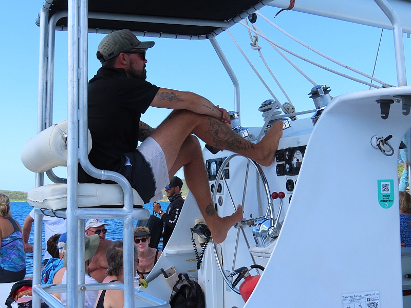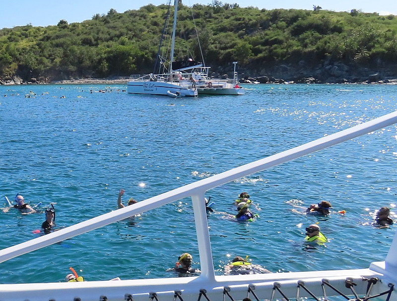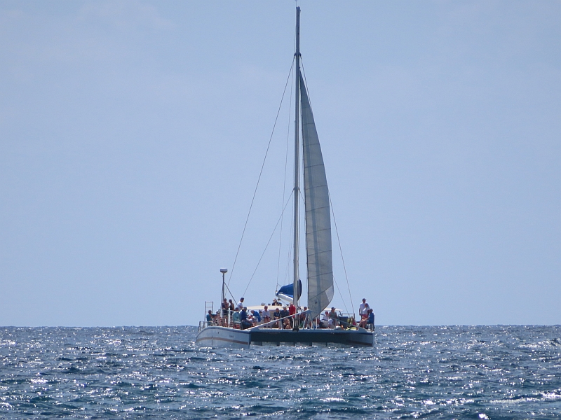 We had an early start to our day which began with a large sailing catamaran taking us out to a bay where we could try snorkelling. This was to be a totally new experience for us, and we were rather anxious about how it would turn out. In preparation, because I am so very short-sighted, I had bought a mask that was fitted with prescription lenses; how well would it work, I wondered?