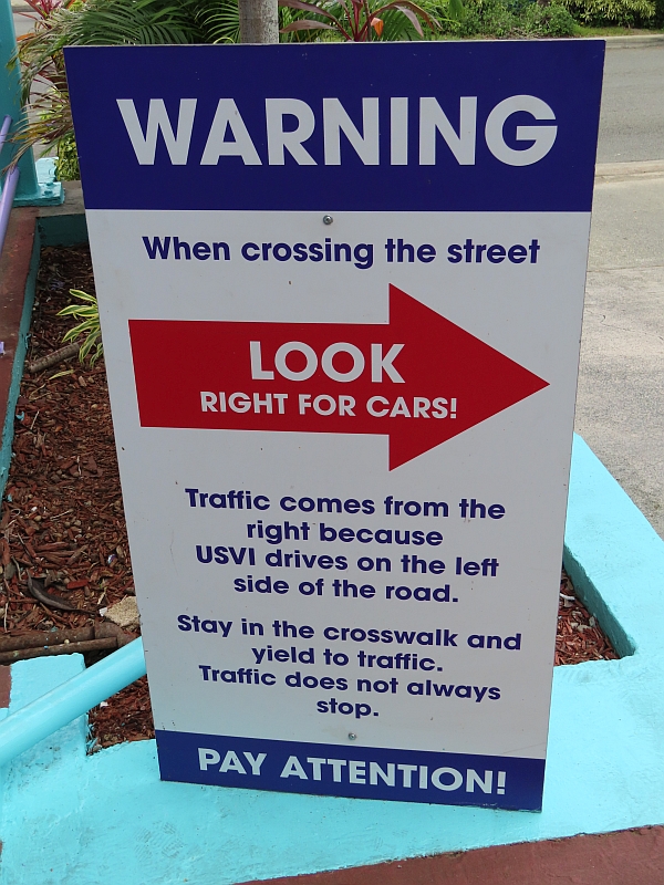Another question for you: on which side of the road do cars drive, on the island of St Thomas? Answer: on the left (because of its historical connections with the UK) but with Left-Hand-Drive cars (because it is part of the US). The sign below warns visitors, most of whom are from the USA.