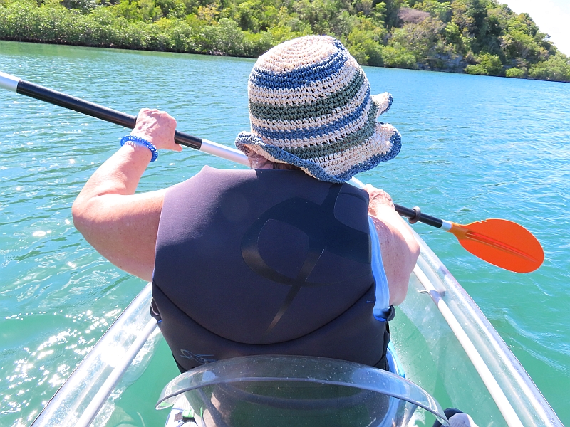 A speedboat took us out to the kayak base, where we were given a short lesson on how best to paddle them, and then we set off as a group to explore the seashore's mangrove forests. Travelling in the transparent kayak was rather like being inside a giant snorkel mask, as it gave a superb view of the sea bed beneath us. Our guide helped us identify the sea-creatures that we saw, lifting some of them up for us to see in close-up, and then we turned back to return to base. Unfortunately an approaching storm meant that the wind started to increase at that time, and together with an outgoing tidal current (not to mention our age and lack of experience) we found it difficult to make good progress, and we were very grateful when one of our guides in a motor boat assisted us with a tow for the last 200 yards.