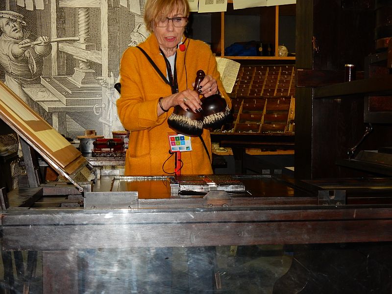 The weather had finally improved, and we enjoyed sitting on the top deck in blazing sunshine as we continued up the river to Mainz. Of particular interest at Mainz was the Gutenburg museum. Gutenburg invented the printing press in the 15th century, and famously used it to produce the Gutenburg Bible of which a few copies survive to this day. We were treated to a demonstration on a replica of the original press; what a slow and tedious process it was (and even then the illuminations of the text were hand-painted afterwards). I was intrigued by the fact that multiple versions of every letter were used, in slightly different widths, to achieve justified margins; this was because it never occurred to the printers of the time that it was only necessary to adjust the sizes of the blank spaces between words to achieve the same effect.