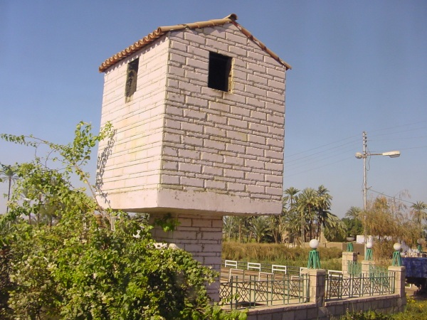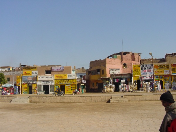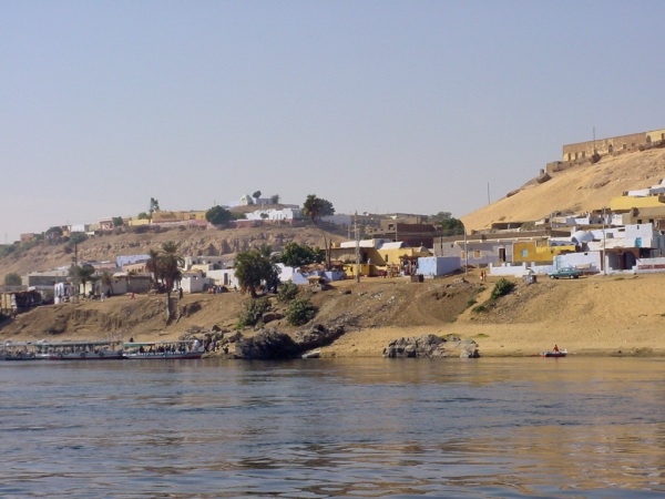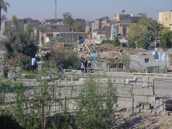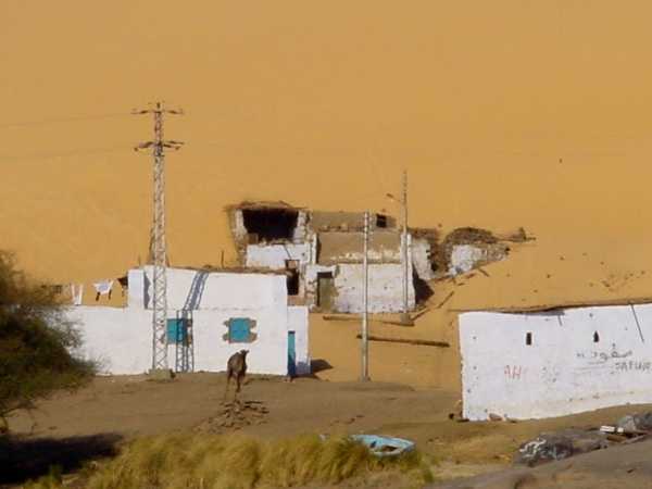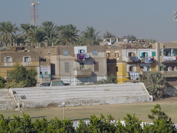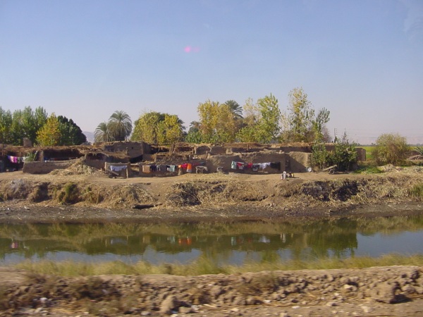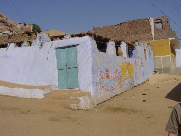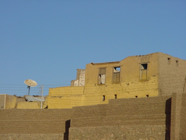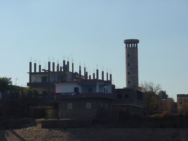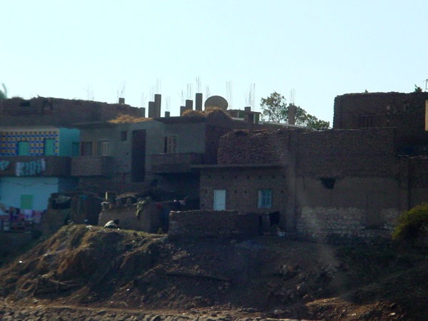 Most Egyptian houses are noticeably unfinished. As there is no need to protect against English-style weather, most houses are left unfinished and with no roof other than a sheet of canvas or some woven reeds, so that it is easy to add another storey if the children don't want to leave home. With their lack of glass windows (un-needed) and peeling paintwork, most houses look like wrecks although inside they may be quite luxurious with fine carpets and wall-hangings, air-conditioning and satellite TV. We had a small competition on board to photo the most tumble-down house with a satellite dish!