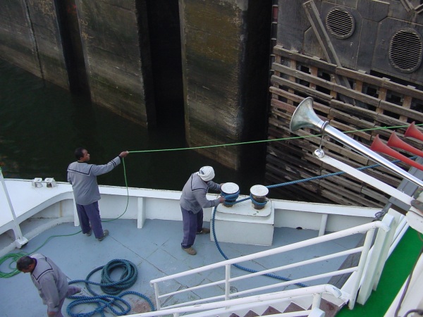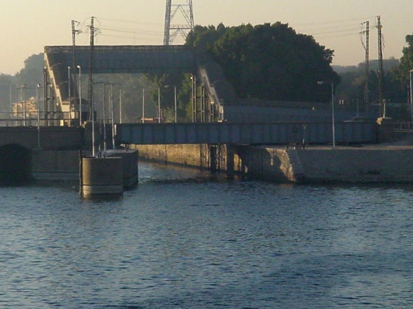 A ship descends Esna Lock around dawn |