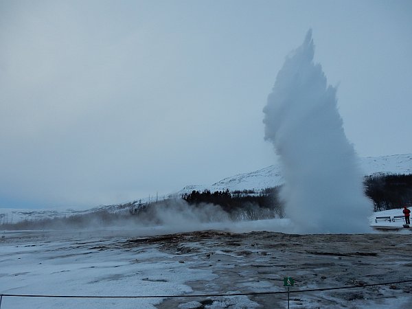 The first destination of the afternoon was Thingvellir National Park. As well as being historically important as the meeting point of the original Icelandic Vikings Parliament, the site is of great geological significance as it is where the American and Eurasian tectonic plates meet, separated only by a broad lava field. We stood briefly at the edge of the American plate, enjoying the view across the lava field to the Eurasian plate a mile or so away (and moving further by about one inch per year) before hurrying back to the warmth of the coach which took us up to the spectacular Gullfoss waterfall. Here the weather was particularly cold and I was extremely glad to return to the cafe at the visitor's centre where they sold the most delicious bowls of traditional Icelandic lamb stew.