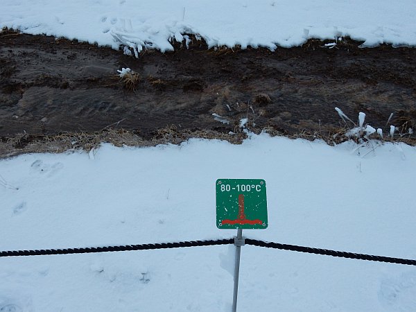 Finally we were taken to the site of the original "Geysir" after which all geysers are named. We were warned not to touch the pretty little streams of water which ran through the snow beside the paths, as the water in them would be almost at boiling point, and the valves which released steam like the lid of a pressure-cooker certainly confirmed that there were high temperatures under the ground.