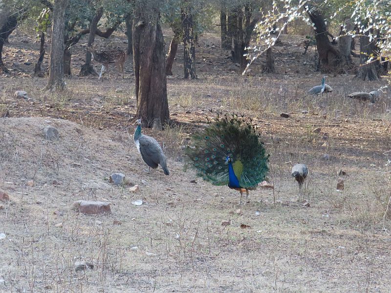 It had been a fabulous encounter, and our guide told us that it had been in his opinion up there amongst the top 5% of sightings. Happily we turned around, thinking that the day couldn't possibly get any better, but there was yet another surprise in store for us as we headed back towards the park exit. As we were pausing to observe Peacocks and an Antelope, suddenly there in the trees was an example of the other apex predator of the park, a Sloth Bear. These are a really scary animal, and suddenly we felt very glad of the protection afforded by the jeep! Our guide reckoned it was a chance in a thousand to have seen crocodiles, tiger, and a bear in this way - and what an amazing birthday it had been for Debbie!