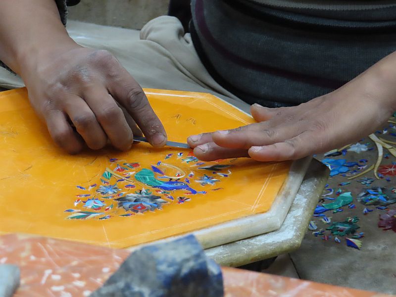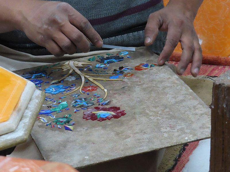 The Taj Mahal took a team of 20,000 labourers almost 22 years to build, using manual methods to create the decorations from literally millions of precious stones. In today's money it cost around £750 million - and it would be literally impossible to duplicate the processes today. We were taken next to see a rare workshop where they still practise these techniques of setting precious stones into marble to create the decorations. It was fascinating to watch the skilled craftsman at work, and to appreciate the level of effort which goes into the process. It takes weeks to produce a single small item such as a plate; it is almost impossible to imagine the effort involved in decorating an entire temple in this way! We were of course given the opportunity to purchase some samples of their work - but at a price which was way beyond our means.