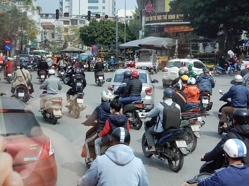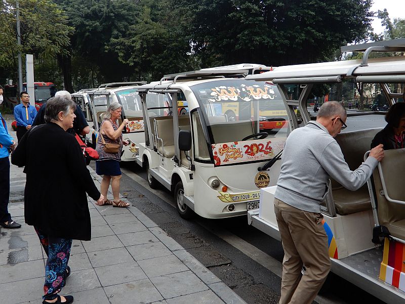 The delays meant that we had missed our day of free exploration in Hanoi, as well as several guided tours; but our Viking guide Cheung was very good in arranging a repeat of the tour that we most looked forwarded to, an exploration of the old quarter and market area by electric tuc-tuc. We were immediately amazed by just how many motorbikes there were, not just on the roads but also seemingly on every inch of pavement. It was explained to us that in the older parts of the city the houses were very narrow but were several stories high, being occupied by 3 or 4 generations of the same family with the oldest (who were least able to climb stairs) living on the 1st floor and with successively younger generations on each floor above. The ground floor however had several different purposes: overnight it provided storage for the many owners' motorbikes, but during the day these would be wheeled out onto the pavement so that it could serve not only as the living area and kitchen but also as a restaurant or as a shop and workshop area.