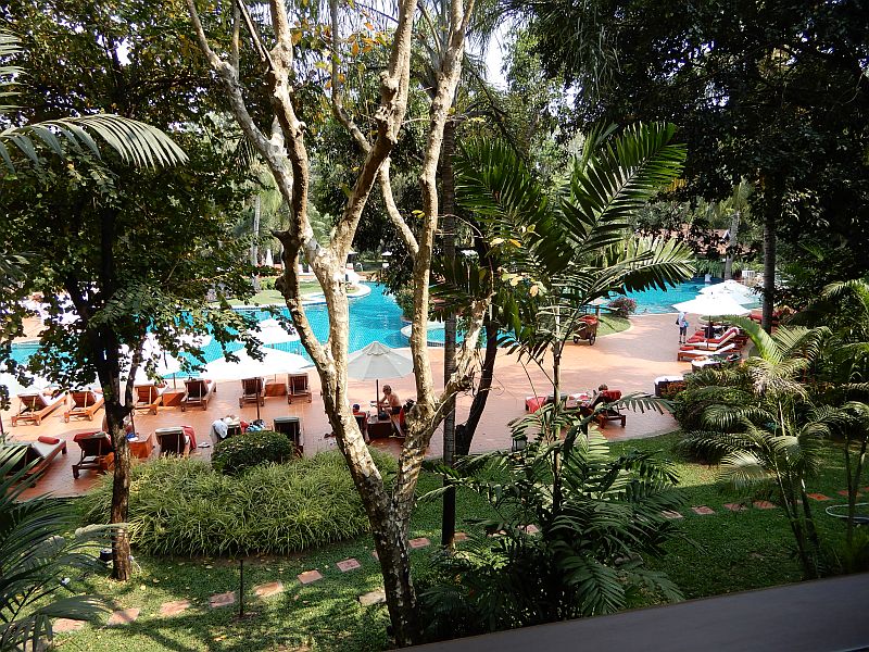 The coach took us for an hour's journey up Cambodia's main highway - which was more like a country lane - and then we were comfortably settled in our hotel there. Again it was an excellent hotel (the Sofitel Angkor Golf and Spa Resort) and our room, although not a suite this time, was huge - even the bed, which was 9ft wide being two double-beds pushed together, seemed tiny in it. The view from the room was beautiful, looking out over the gardens to the swimming pool, and we were very happy to know that we would be spending 3 nights there.