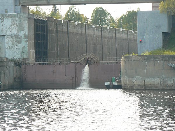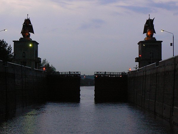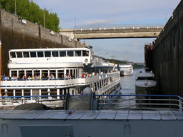 For the first 75 miles you are on the Moscow Canal which was built in 1937; it lowers you by 160 feet through 6 locks to the Volga River. The locks are wide enough for only a single ship, but easily long enough for two ships. There are floating hooks in the lockside for the ropes, but the remains of the original sets of bollards can often still be seen. The top gates are unusual in that they usually lie flat on the canal bed, and are rotated into an upright position once the ship has passed over them.