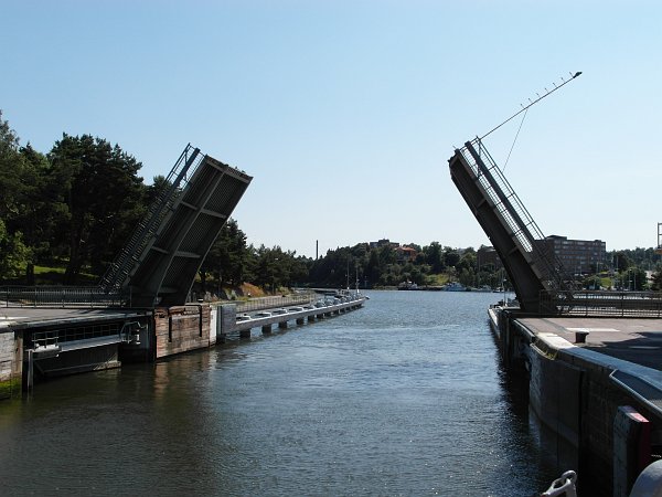 Soon we were crossing lake Malaren and passing the beautiful Drottningham Castle which has been the Royal Family's residence since 1981. Lake Malaren is the third largest in Sweden, and it is kept just 1ft above sea level for, although there is virtually no tide in this part of the Baltic, even slight changes in sea level would otherwise cause unacceptably rapid currents to flow through its approaches. Under blue skies we crossed the lake and then locked back down to sea level through a huge lock (450 ft long) - having taken a shortcut past several miles of Baltic Sea. The navigation here was crossed by a road with a lift bridge and by a railway at a higher level; bridges were to be a notable feature of the trip; for example a few miles south of the lock we passed under a set of three bridges which could each be opened in a different way; one opened in the middle, one opened from just one end, and one remained horizontal while the whole bridge platform was raised or lowered.